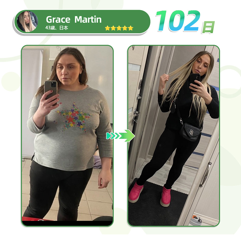 使用開始から2週間後、再び連絡し、「今では完全に効果を実感しており、これからも続けます!」と伝えました。わずか3か月で、理想の体重 136ポンド(約62kg) に到達できました。ほとんど努力することなく達成できました。本当の成果ほど説得力のあるものはなく、誇張された宣伝文句とは比べ物になりません!